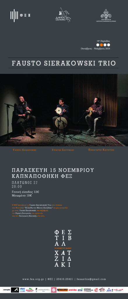 Η ΦΕΞ σας προσκαλεί σε μια υπέροχη συναυλία του Fausto Sierakowski Trio την Παρασκευή 15 Νοεμβρίου 2024 και ώρα 20:00 στην Καπναποθήκη της ΦΕΞ, Πλάτωνος 27.