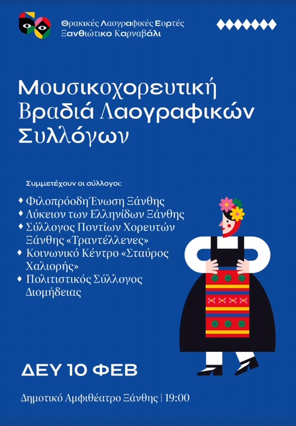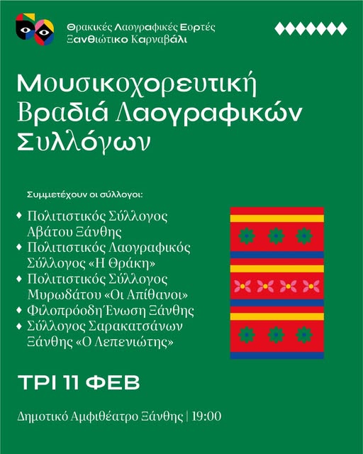 Την Δευτέρα 10 και την Τρίτη 11 Φεβρουαρίου το τμήμα των ενηλίκων συμμετέχει μαζί με άλλους συλλόγους στις μουσικοχορευτικές εκδηλώσεις του Δήμου, στο Δημοτικό Αμφιθέατρο Ξάνθης στις 19:00.