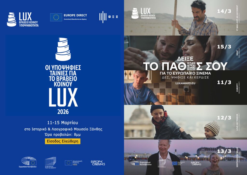Το Europe Direct Ανατολικής Μακεδονίας και Θράκης σε συνεργασία με την Κινηματογραφική Λέσχη της ΦΕΞ παρουσιάζουν τις υποψήφιες ταινίες για το Βραβείο Κοινού LUX 2026 του Ευρωπαϊκού Κοινοβουλίου, σε μια σειρά προβολών με ελεύθερη είσοδο για το κοινό.