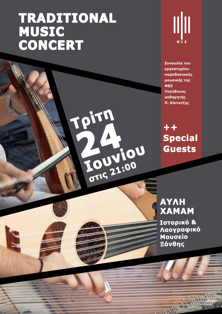 Το Εργαστήρι Παραδοσιακής Μουσικής της ΦΕΞ πρόκειται να μας χαρίσει μια υπέροχη συναυλία στην πιο όμορφη αυλή της πόλης, στην αυλή με τα χαμάμ του Ιστορικού & Λαογραφικού Μοουσείου της Ξάνθης.