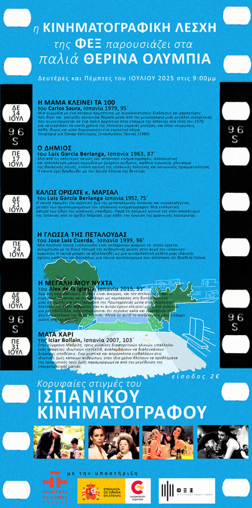Η Κινηματογραφική Λέσχη της ΦΕΞ Ξάνθης σε συνεργασία με το Ινστιτούτο Θερβάντες και την Πρεσβεία της Ισπανίας παρουσιάζει στα Παλιά Θερινά ΟΛΥΜΠΙΑ κάτω από το φως των αστεριών κορυφαίες στιγμές του ΙΣΠΑΝΙΚΟΥ ΚΙΝΗΜΑΤΟΓΡΑΦΟΥ κάθε Δευτέρα και Πέμπτη του Ιουλίου ώρα 9 μμ.