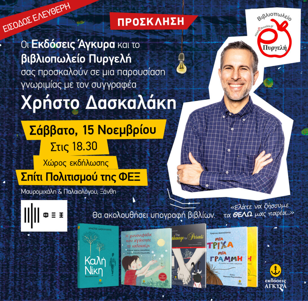 To Σάββατο 15 Νοεμβρίου στις 18:30 στο Σπίτι Πολιτισμού της ΦΕΞ υποδεχόμαστε τον Χρήστο Δασκαλάκη όπου μέσα την παρουσίαση των βιβλίων του θα γνωρίσουμε καλύτερα και τον ίδιο αλλά και τους πρωταγωνιστές των ιστοριών του.