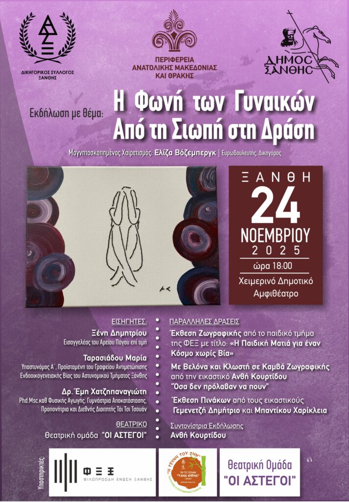 Η εκδήλωση θα πραγματοποιηθεί τη Δευτέρα 24 Νοεμβρίου στο Δημοτικό Αμφιθέατρο Ξάνθης στις 18:00.