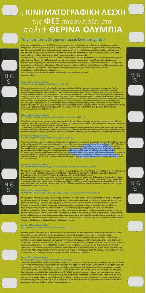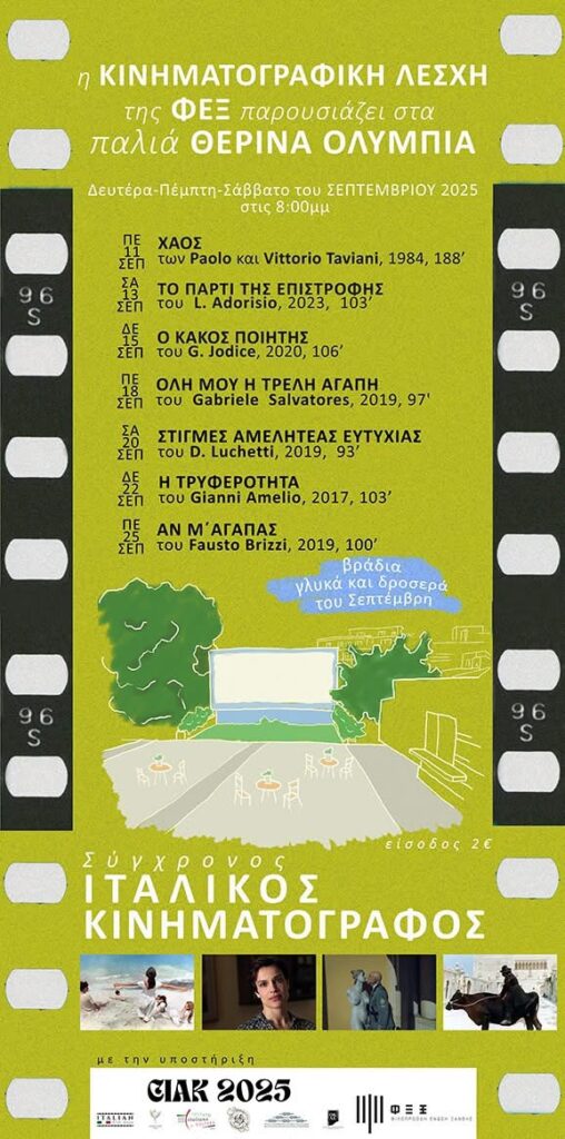 Από την Πέμπτη 11 Σεπτεμβρίου έως και Πέμπτη 25 Σεπτεμβρίου 2025 θα προβληθούν ιταλικές ταινίες αριστουργήματα, κάθε Δευτέρα, Πέμπτη και Σάββατο, ώρα 8 μμ. που στοχεύουν να παρουσιάσουν στο ελληνικό κοινό διαφορετικές εκφάνσεις της σύγχρονης ιταλικής κινηματογραφικής δημιουργίας. Το Φεστιβάλ πραγματοποιείται στην Ελλάδα με την συνεργασία του Πολιτιστικού Σωματείου AIAL στο πλαίσιο του Δικτύου Ελληνο-Ιταλικής Πολιτιστικής Συνεργασίας με την υποστήριξη της Ομοσπονδίας Κινηματογραφικών Λεσχών της Ελλάδας, και παρουσιάζει φέτος 7 ταινίες αντιπροσωπευτικές της Ιταλικής παραγωγής.