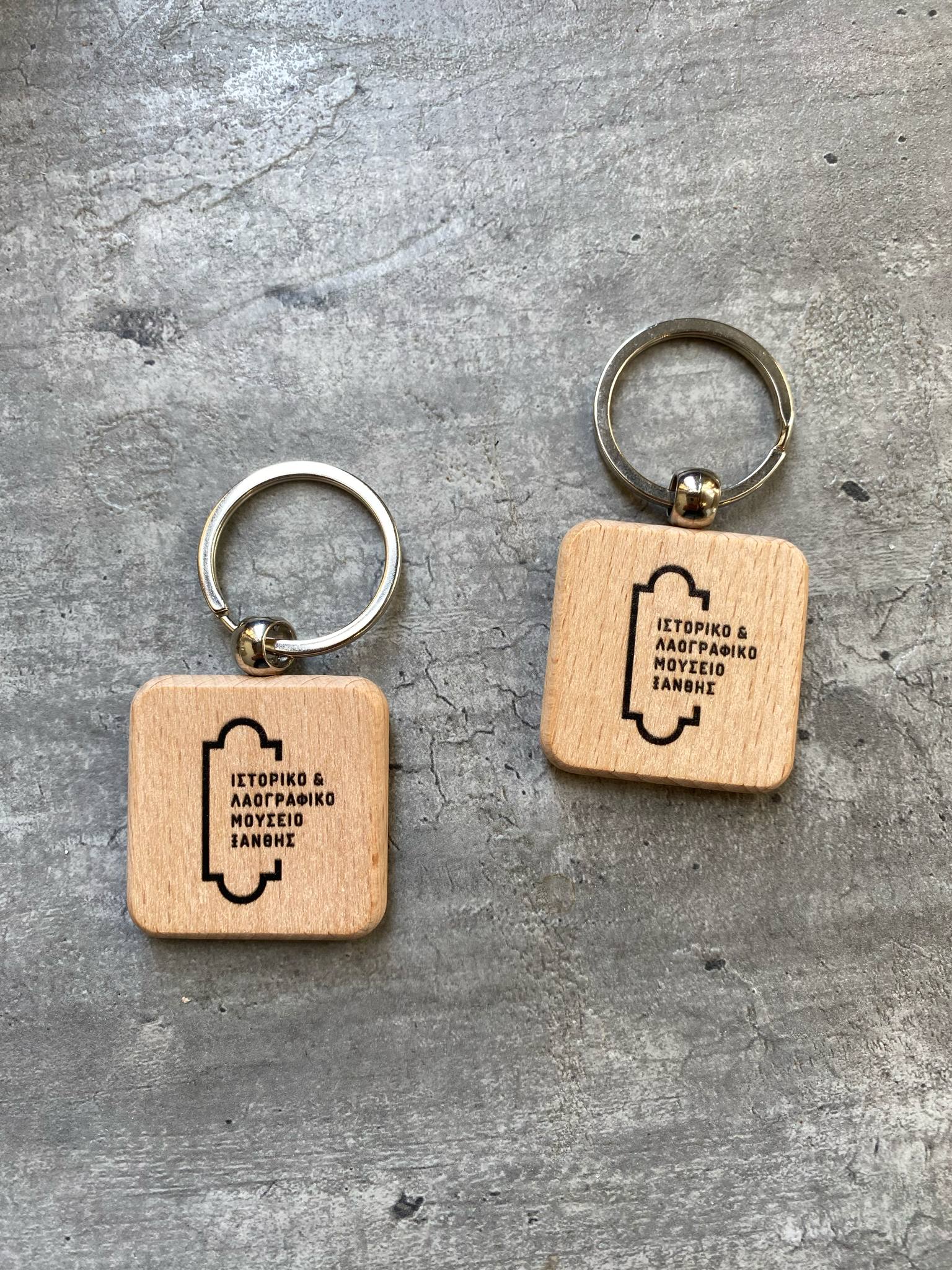 Ξύλινο μπρελόκ για να κοσμήσει τα κλειδιά σας. Το σχέδιό του είναι εμπνευσμένο από έκθεμα μουσείου, το λεγόμενο “τεπελίκι” το οποίο ήταν παραδοσιακό κόσμημα. Το στόλιζαν στα μαλλιά τους οι γυναίκες και το συνδίαζαν με την παραδοσιακή φορεσιά. Στην πίσω όψη αναγράφεται το λογότυπο του μουσείου.