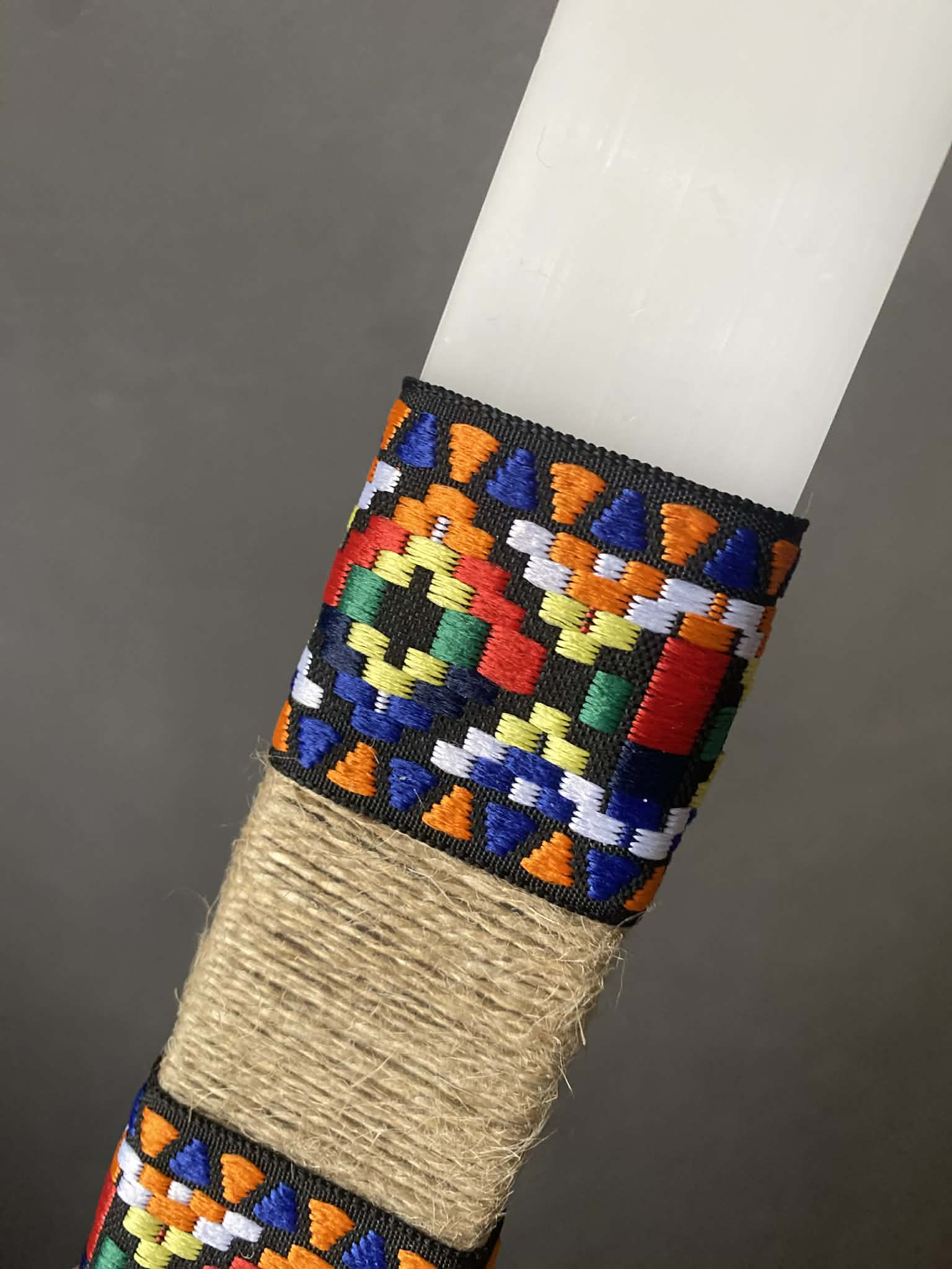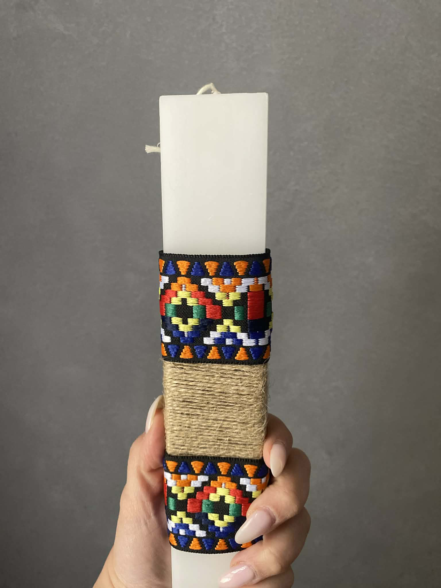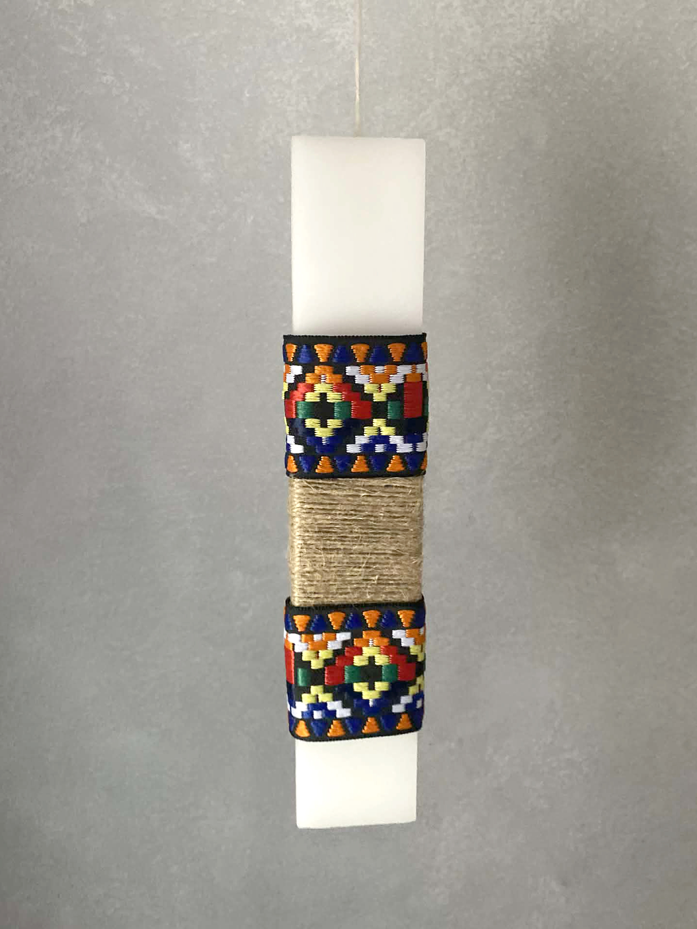 Χειροποίητη λαμπάδα από 100% φυσικό κερί με παραδοσιακά υφάσματα και αξεσουάρ.