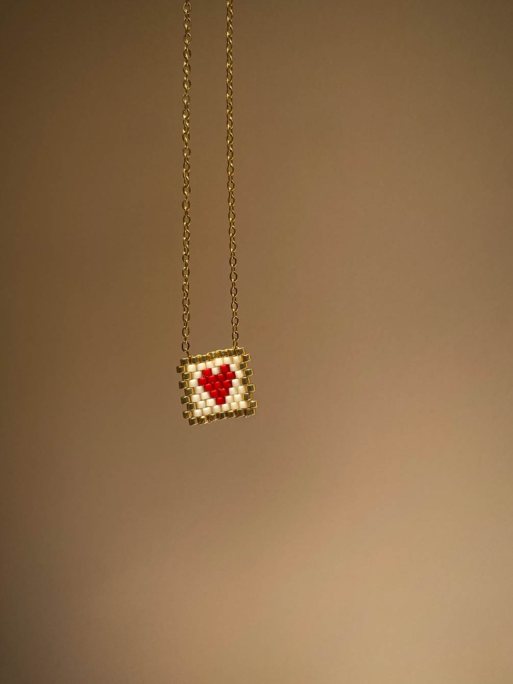 Χειροποίητο κολιέ με χάντρες σε σχέδιο καρδιά και χρώμα λευκό-κόκκινο με επιχρυσωμένη αλυσίδα από ατσάλι.