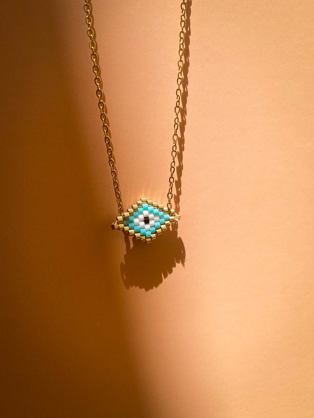 Χειροποίητο κολιέ με χάντρες σε σχέδιο ματάκι-ρόμβος και χρώμα γαλάζιο-λευκό με επιχρυσωμένη αλυσίδα από ατσάλι.