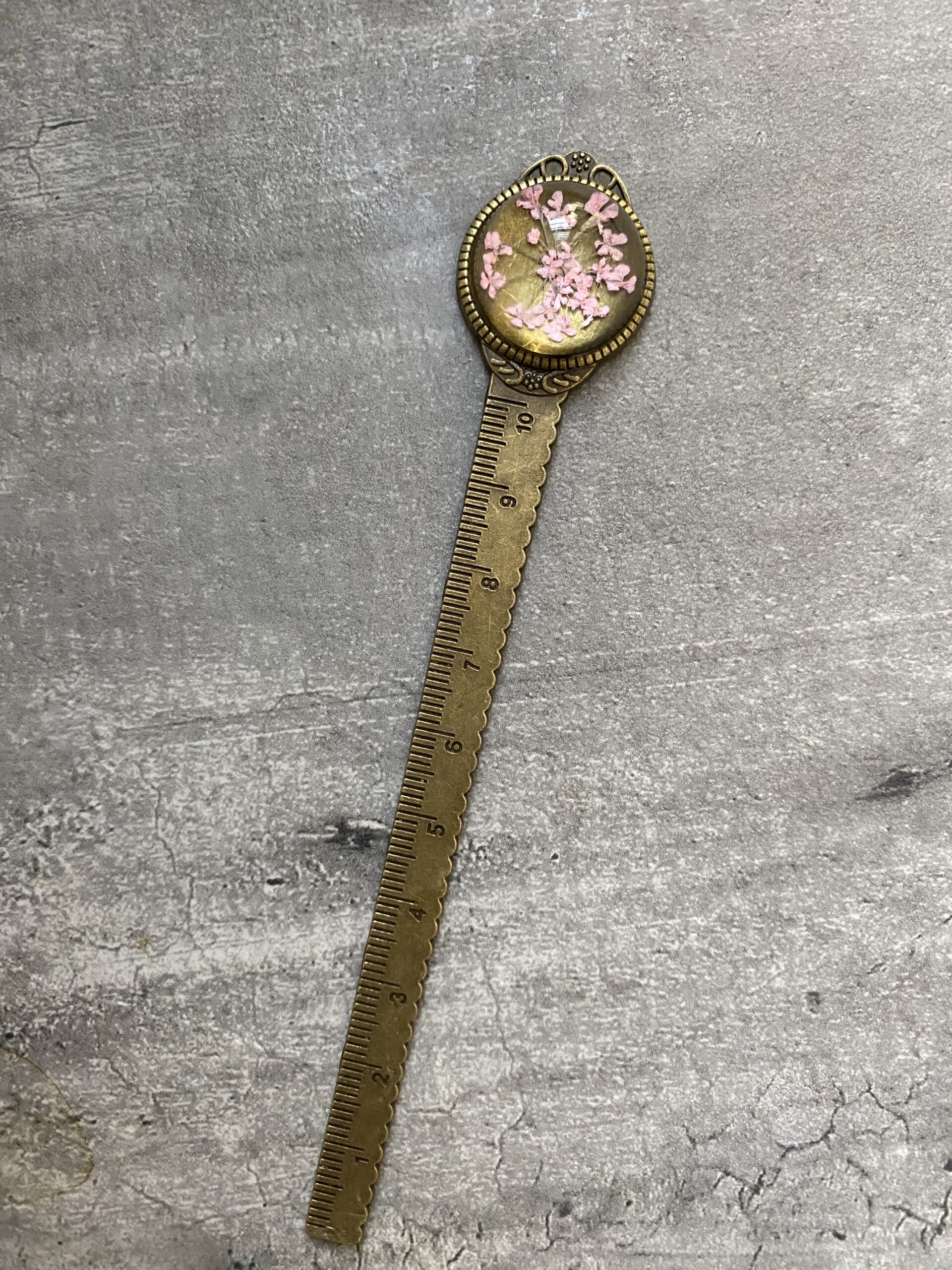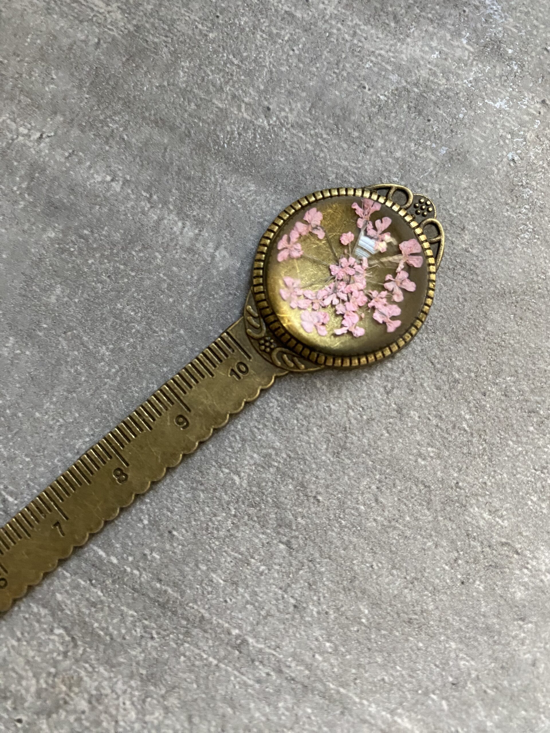 Μεταλλικός σελιδοδείκτης με χάρακα 10 εκατοστών σε vintage στυλ. Το επάνω μέρος αποτελείται από στρόγγυλο σχέδιο ρυτίνης (υγρό γυαλί) με αποξηραμένα ανοιχτό ροζ λουλούδια στο εσωτερικό του.